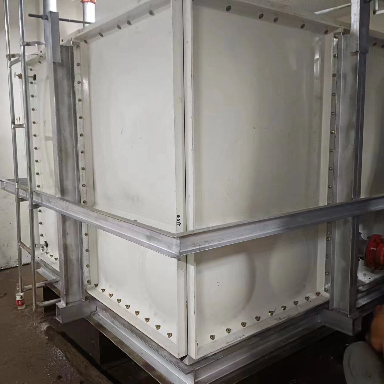 我司承接的山東省菏澤市單縣公安局執(zhí)法辦案中心無內(nèi)件外加固玻璃鋼水箱已經(jīng)安裝試水完成。由于水質(zhì)特殊性采用的是水箱內(nèi)部無支撐拉筋等輔助配件,在水箱外側(cè)用工字鋼加固。可以大大延長水箱的使用壽命。