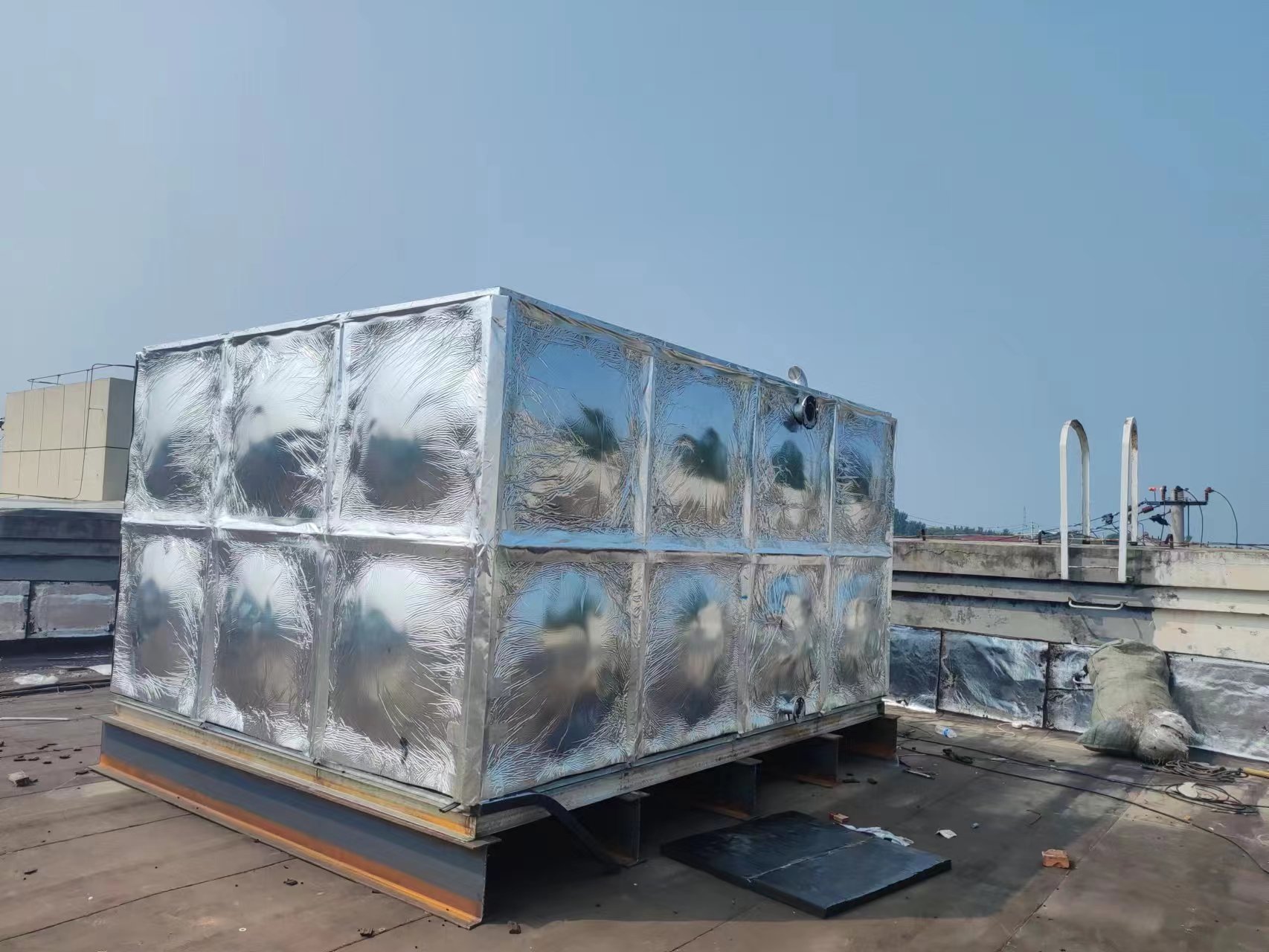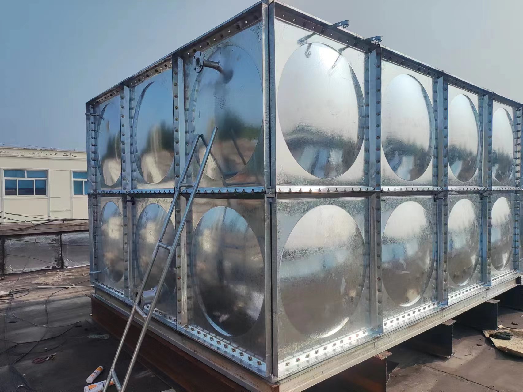 我司承接的山東省濱州市惠民縣石廟鎮衛生院樓頂項目,僅用一天的時間安裝試水完成。此水箱作為消防儲水使用。該產品適用于建筑給水的貯存、調節水箱,采暖系統的膨脹、凝結水箱以及建筑施工、地質勘察、工業、國防工程等臨時貯水水箱。水箱的進水管、出水管及溢流管的管徑、位置由設計決定;水箱四周應有不少于700mm通道,箱底及箱頂不少于600mm。安裝時箱底四周及箱底標準快之間的連接縫隙要座落在支座上。