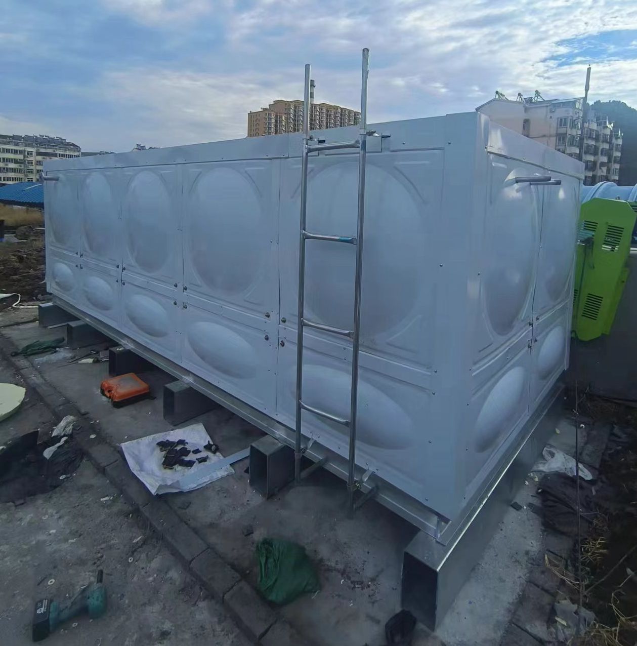 我司承接的山東省濟南市市中區東方康明餐飲公司玻璃鋼消防水箱已安裝試水完畢。SMC組合式玻璃鋼水箱是由整體優質的SMC水箱板拼裝而成。其特點是采用不飽和樹脂,因此水質好,清潔無污染;具有強度高,重量輕,耐腐蝕,外型美觀,使用壽命長,保養管理方便等特點。可根據用戶需要組裝0.125-1500立方米的水箱。若原有水箱需要更換,不需要改造房屋,適應性很強。專門研制的定型產品密封帶,該密封帶耐水、彈性大、變型小,緊固密封。水箱整體強度高,無滲漏,無變形,保養、檢修方便。我公司生產的玻璃鋼水箱廣泛適用于工礦、企事業單位、住宅、賓館、飯店等建筑,作為生活飲用水、中水處理、消防用水及其他用水儲水設施。