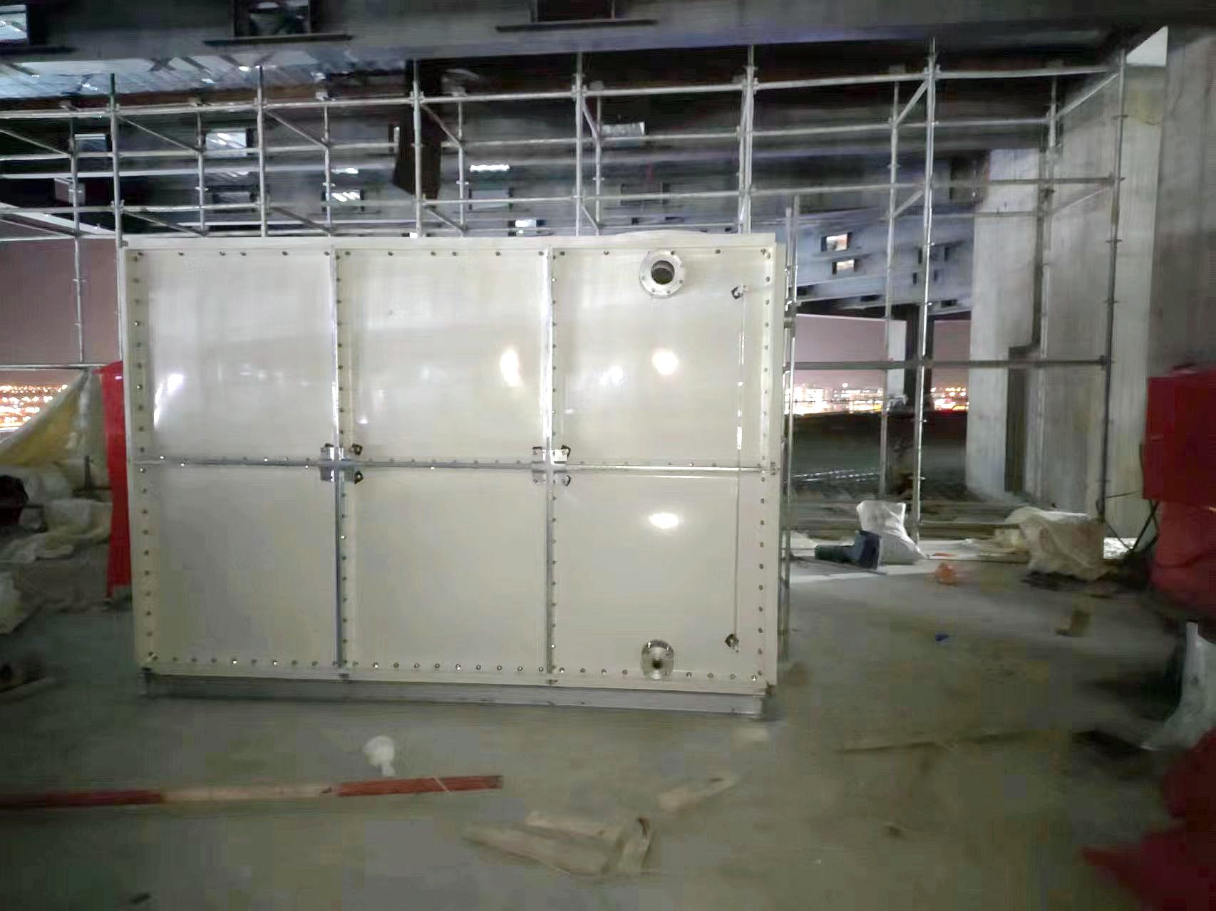 我司承接的河北省保定市雄安新區中化集團現代化辦公樓消防臨時水箱項目,已安裝試水完畢。玻璃鋼水箱整體由好的SMC水箱板拼裝而成,造價低。其特點是采用樹脂,因此水質好,清潔;具有強度高,重量輕,耐腐蝕,外型美觀,使用壽命長,保養管理方便等特點。