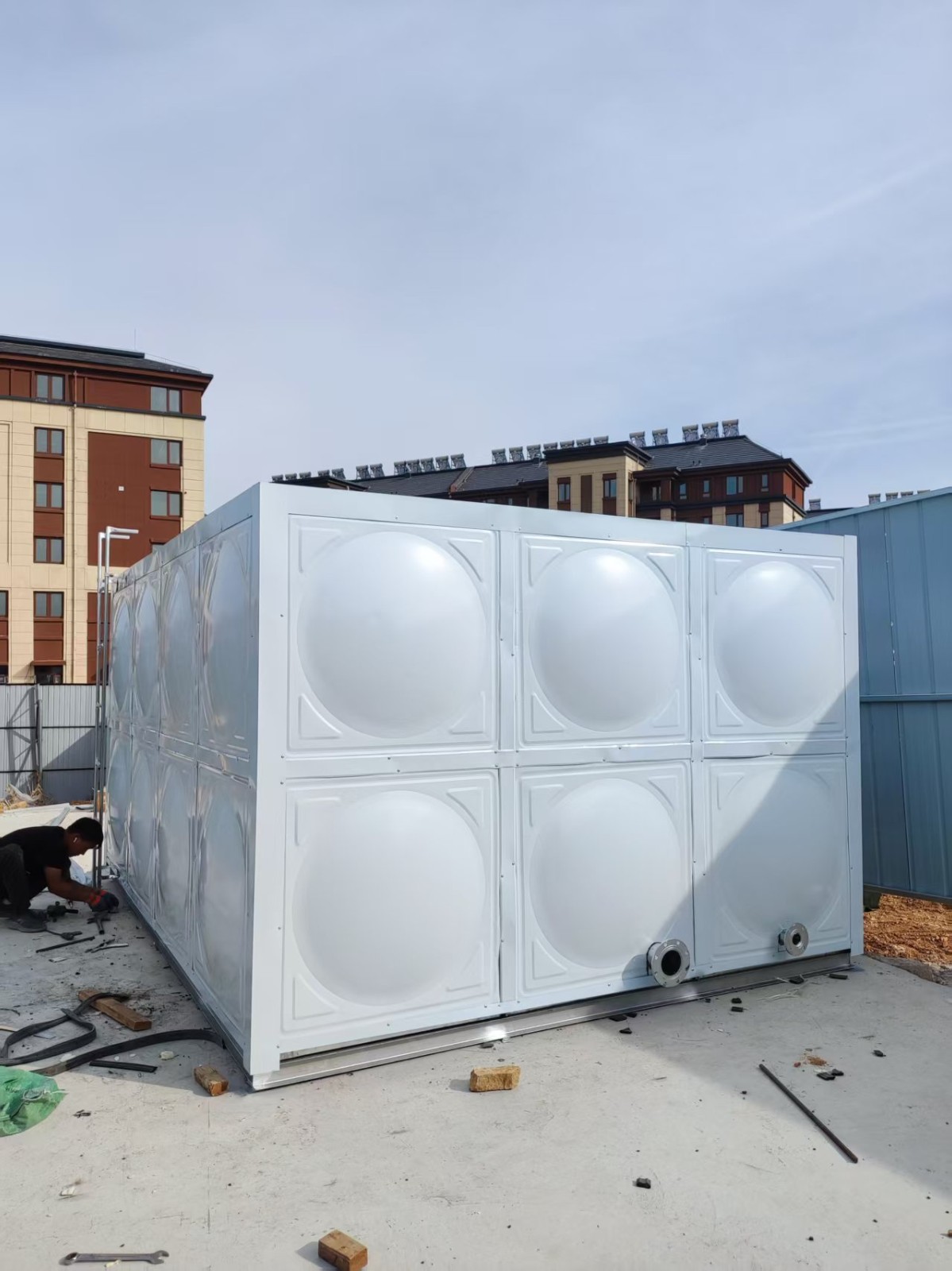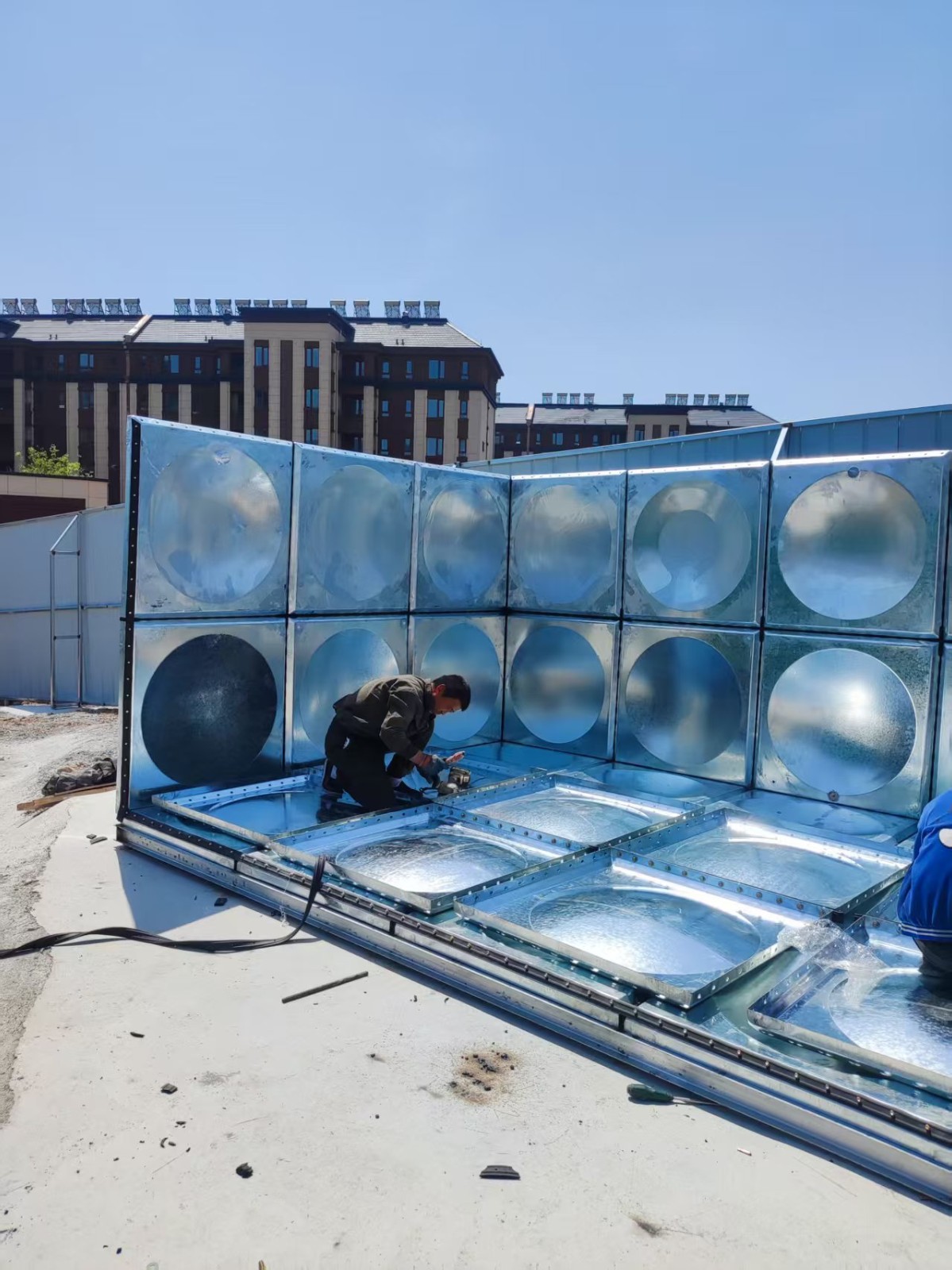 我司承接的山東省泰安市濟南中冶十二局臨時消防水箱項目,僅用一天的時間安裝試水完成。鍍鋅鋼板水箱具有重量輕、造價低、安裝簡單、用途廣等優(yōu)點。